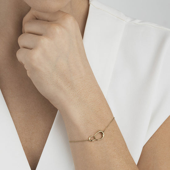 Georg Jensen 18ct yellow gold Offspring bracelet 10015344. American designer Jacqueline Rabun is the woman behind the Offspring collection and she is known for her sculptural, organic aesthetics – and her ability to create jewellery that almost becomes a part of you. Understated yet elegant and timeless, the Offspring bracelet tells the story of the unbreakable bond between mother and child and adds something truly chic to your appearance. Two delicately crafted 18ct yellow gold egg shapes are interlocked at the end of the golden bracelet, serving as an emotional tribute to the power of a mother’s love. Item number: 10015344 Materials:18 kt. yellow gold Measurements: L: 180 mm / 7.09 inches. 0.9 mm anchor chain The length of the bracelet can be adjusted by using the loops (2-4 cm) Design year: 2019 Launch year:2019 Collection: Offspring The length of the bracelet can be easily adjusted using the loops.