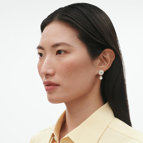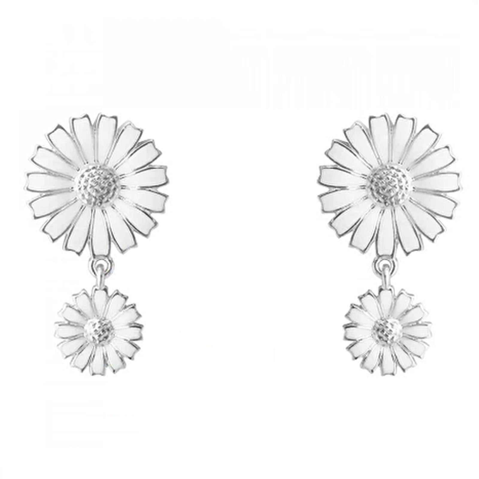 Two dangling daisies in different sizes give life to these beautiful sterling silver earrings. Hand-plated in white enamel, the pieces feature a slightly reworked design of the classic Georg Jensen motif. The earrings reference a 1940s daisy-shaped brooch gifted to HM Queen Margrethe II of Denmark. Product details Item number: 20001542 Materials: Sterling Silver, White enamel Measurements: H: 23 mm / 0.91 inches. W: 13 mm / 0.51 inches.