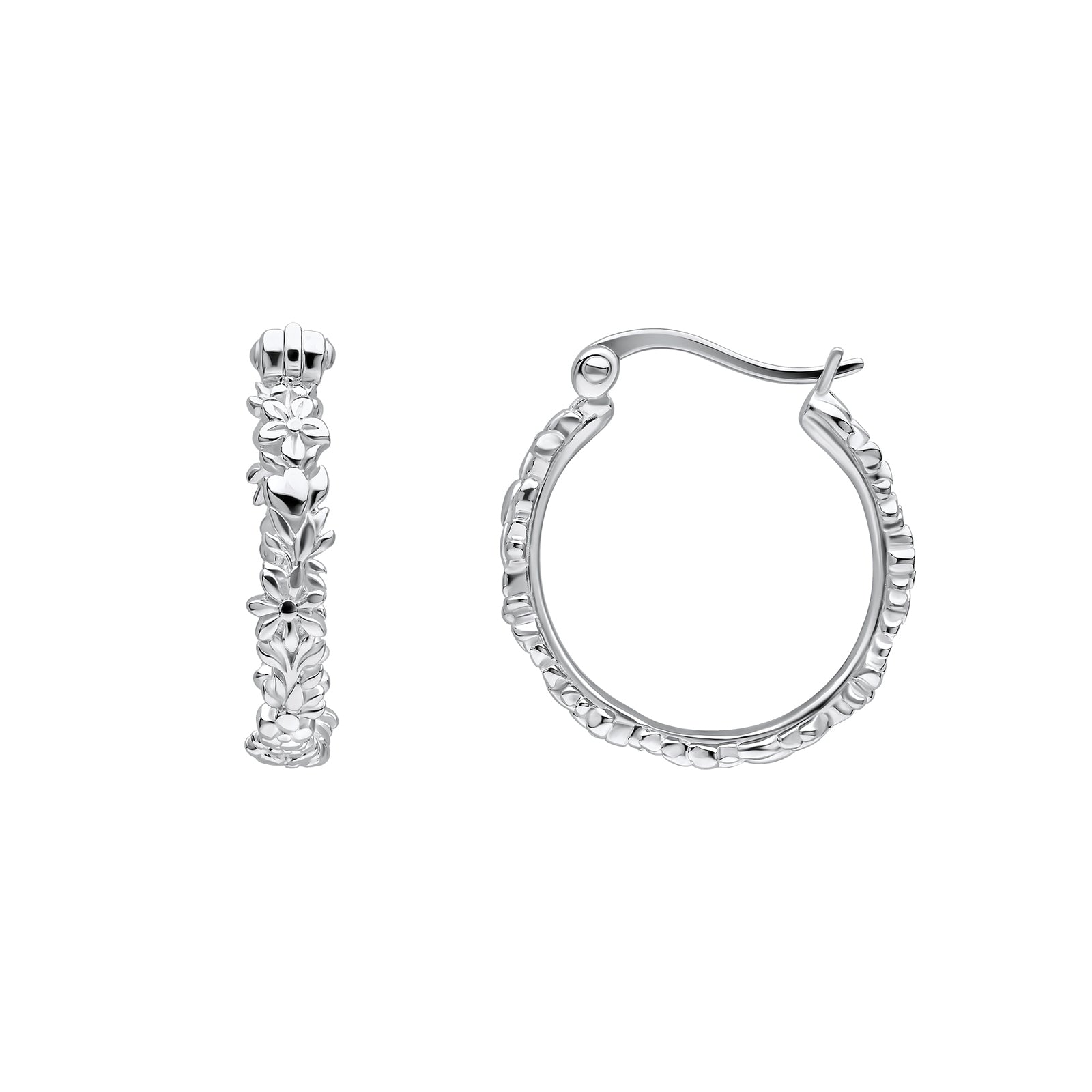 Beautifully crafted from recycled sterling silver, these elegant hoop earrings are inspired by Laura Ashley’s Naunton Folly print. A bespoke painted piece drawn from the rich heritage of the Laura Ashley archive; it combines elements from various prints to create an inviting British stately home garden scene. Featuring a graceful trail of tiny flowers, the design of these earrings reflects the intricate blooms and soft symmetry of the rose archways and clipped topiary found in the print. Perfect for adding a feminine touch to any outfit. Dimensions (WxHxD):  18 x 18 x 4mm