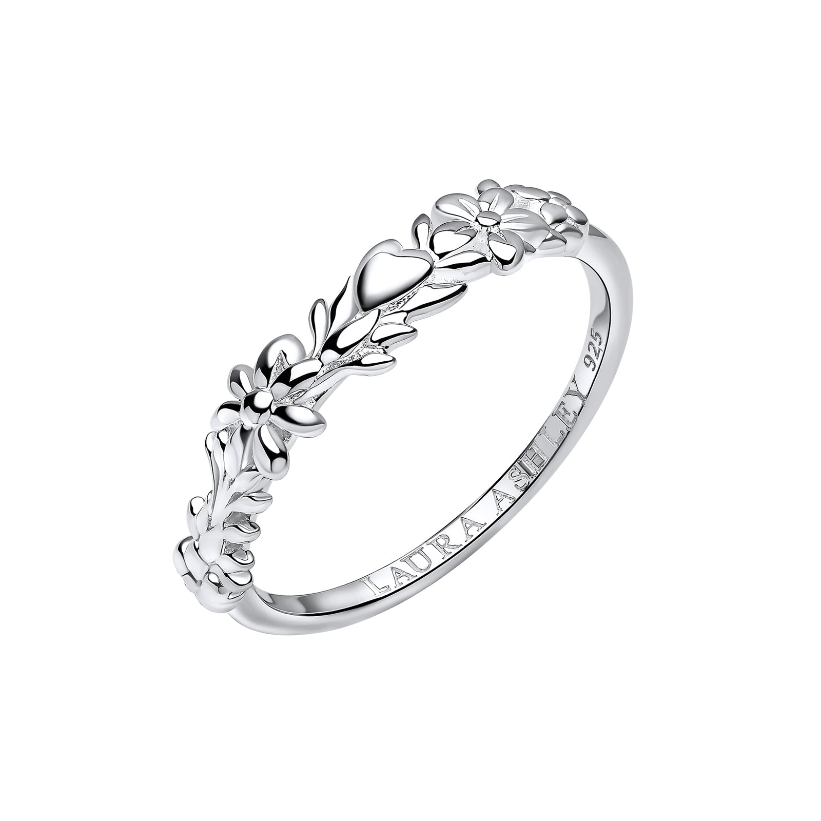 Beautifully crafted from recycled sterling silver, this charming floral ring is inspired by Laura Ashley’s Naunton Folly print. A bespoke painted piece drawn from the rich heritage of the Laura Ashley archive; it combines elements from various prints to create an inviting British stately home garden scene. Delicate flowers on this ring wrap around the finger like a garland, mirroring the intricate floral archways and scattered garden blooms featured throughout the print. Perfect for adding a feminine touch to any outfit. Dimensions (WxHxD): 18.61 x 5 x 2 mm. Size 54.