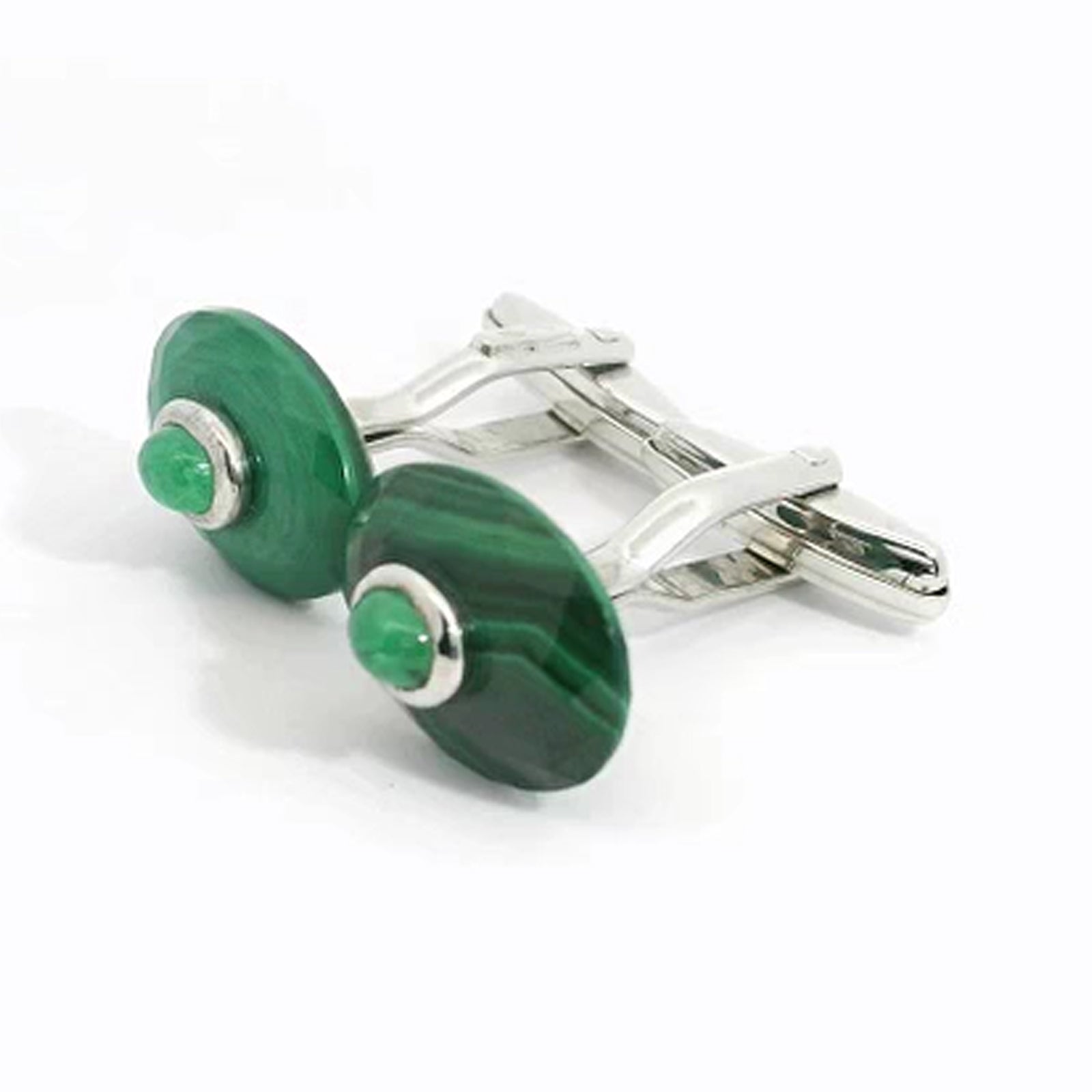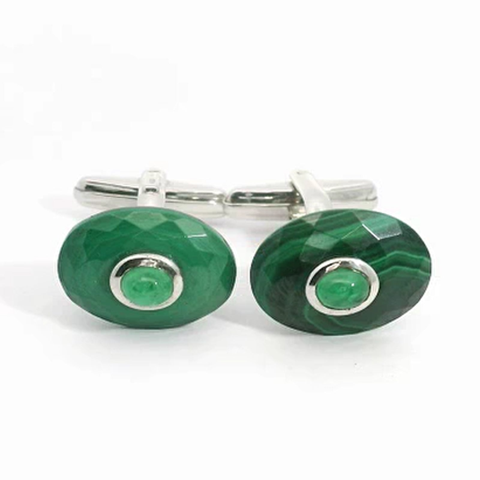 Silver Oval Malchite & Emerald Swivel Cufflinks. Emerald :0.67ct. There is a natural colour variation in these cufflinks, one is slightly darker than the other, due to the natural malichite and emerald gemstones.