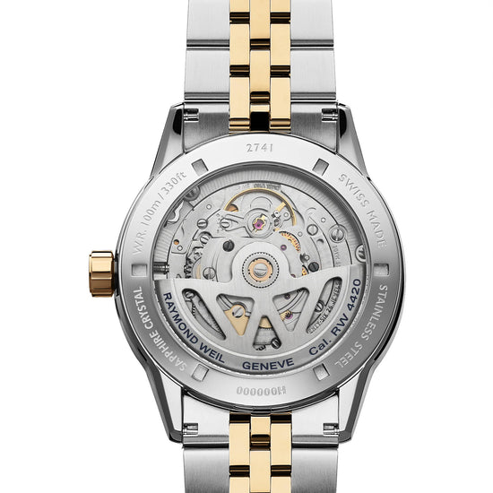Equipped with the RW4420 mechanical self-winding movement with a 41-hour power reserve, this freelancer timepiece combines technical precision with refined aesthetics. The 40mm case, crafted from stainless steel with yellow gold PVD plating, features curvier lugs and tighter bezel lines, designed to enhance light reflection and ensure an improved fit on the wrist. The captivating sunrayed cream dial creates a sophisticated depth and dynamic play of light. Applied indexes enhanced with white Super-LumiNova and refined hands ensure optimal legibility, while the large date display at 3 o’clock adds a contemporary character. A subtle minute track positioned on the inner bezel completes the harmonious design. The two-tone bracelet, fitted with a double-push folding clasp, offers both comfort and security. A screwed-down crown embossed with the RW monogram and a transparent sapphire caseback reveal the automatic movement within, showcasing the W-shaped oscillating weight—a distinctive signature of the brand. Water-resistant up to 100 meters, this timepiece embodies both performance and elegance. Launched in 2007, the freelancer collection was created in honor of the free-spirited man who wishes to remain in control of his own destiny. Blending classic elegance with modern refinement, this latest addition continues to capture the collection’s signature balance of independence and timeless design. Technical datas Collection: freelancer Size: Gents Shape: Round Movement: Mechanical with automatic winding Power Reserve: 41 hours Case Material: Stainless steel with yellow tone PVD coating Case size: 40 mm Case Thickness: 9.77 mm Case Back: Screwed-down, with sapphire crystal Water Resistance: 100 m, 330 ft, 10atm Crystal: Sapphire with anti-reflection coating on both sides Dial: Sun rayed cream with applied indexes Crown: Screwed-down, with RW monogram Clasp: Stainless steel folding clasp with double push-security system Bracelet Stainless steel with yellow gold PVD plating