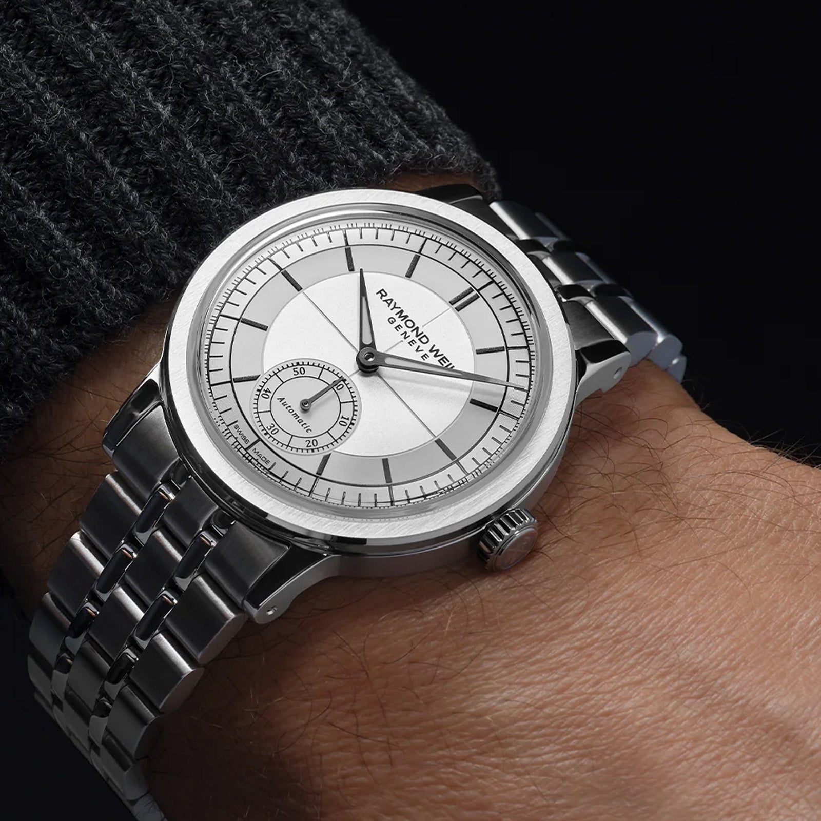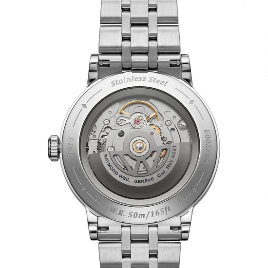RAYMOND WEIL pays homage to the rich heritage and traditions of horology while celebrating the simplicity of refined design. The brand has naturally delved into the past, creating timepieces that offer period charm combined with present-day practicality. The dial, located beneath a vintage-inspired sapphire crystal glass-box, has been refined to the highest degree. The hours and minutes are eloquently conveyed with silver-toned hands, lined with Super-LumiNova. The sector dial presents the hours, minutes and seconds periods on discrete tracks, augmenting readability. A closer inspection of the dial reveals contrasting finishes, the hour track is smooth, the minute track is snailed and the central area of the dial is adorned with a delicate vertical brush. The millesime features a small seconds display at 6 o’clock, delineated with a neat, recessed circlet, introducing a seemly play with depths, which is enriched with a tasteful selection of details. The bezel is decorated with a vertical satin-brush that contrasts wonderfully with the highly polished bevel nearby. This juxtaposition of two finishes reinforces the overall level of finishing. A sapphire case back affords sight of the self-winding movement within and the “W-shaped” oscillating weight, RAYMOND WEIL’s horological signature. The neo-vintage charm of the millesime timepiece is enhanced with a stainless steel bracelet, refined with a 5-row design. This touch of modern elegance is also available in a corresponding leather strap with a unique W-stitched detail. As the name suggests, the collection is a grand vintage interpretation of the RAYMOND WEIL brand. Technical datas Collection: millesime Size: gents Shape: Round Movement: Mechanical self-winding movement, with small seconds hand at 6 o’clock – RW4251Power Reserve: 41 hours Movement Caliber Height: 4.6 mm Case Material: Stainless steel Case size: 39 mm Case Thickness: 10.25 mm Case Back: Snapped, with sapphire crystal Water Resistance: 50 m, 165 ft, 5atm Crystal: Glass box sapphire crystal with dual-sided antireflective treatment Dial: Silver sector dial, with various finishes Crown: Fluted with RW monogram Clasp: Stainless steel folding clasp with double push-security system Bracelet Stainless steel