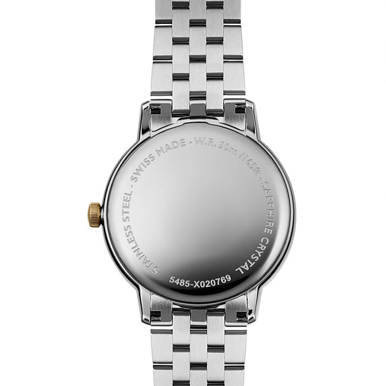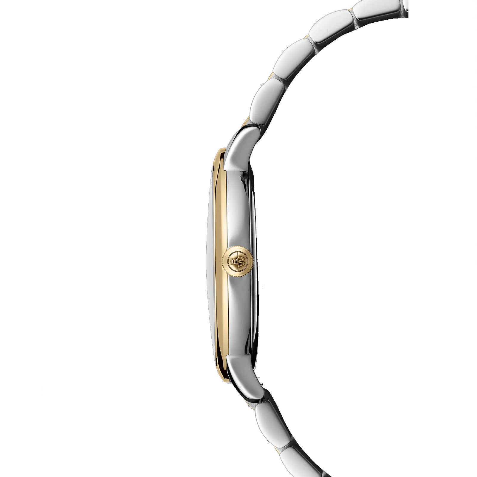 Equipped with a quartz movement and made entirely of stainless steel, this toccata men’s two-tone watch features a 39 mm stainless steel case with yellow gold PVD plating and a date window at 3 o’clock. The white lacquered dial is set with applied Roman numeral indexes and has a railway-track chapter ring that aids readability. To complement this modern classic, a pair of blue hands has been added. Refined design and timeless materials: the toccata collection celebrates the artistic and musical spirit behind the Brand’s DNA. Following in the footsteps of the great composers, toccata promotes the Swiss horology of RAYMOND WEIL while respecting the tradition and heritage handed down from generation to generation within the family company. Technical datas Collection: toccata Size: gents Shape: round Movement: quartz Movement Caliber Height: 2.5 mm Case Material: stainless steel with yellow gold PVD plating Case size: 39 mm Case Thickness: 7.89 mm Case Back: snapped Water Resistance: 50 m, 165 ft, 5atm Crystal: sapphire Dial: white, with applied Roman numerals Crown: with RW monogram Clasp: stainless steel folding clasp with double push-security system Bracelet stainless steel with yellow gold PVD plating