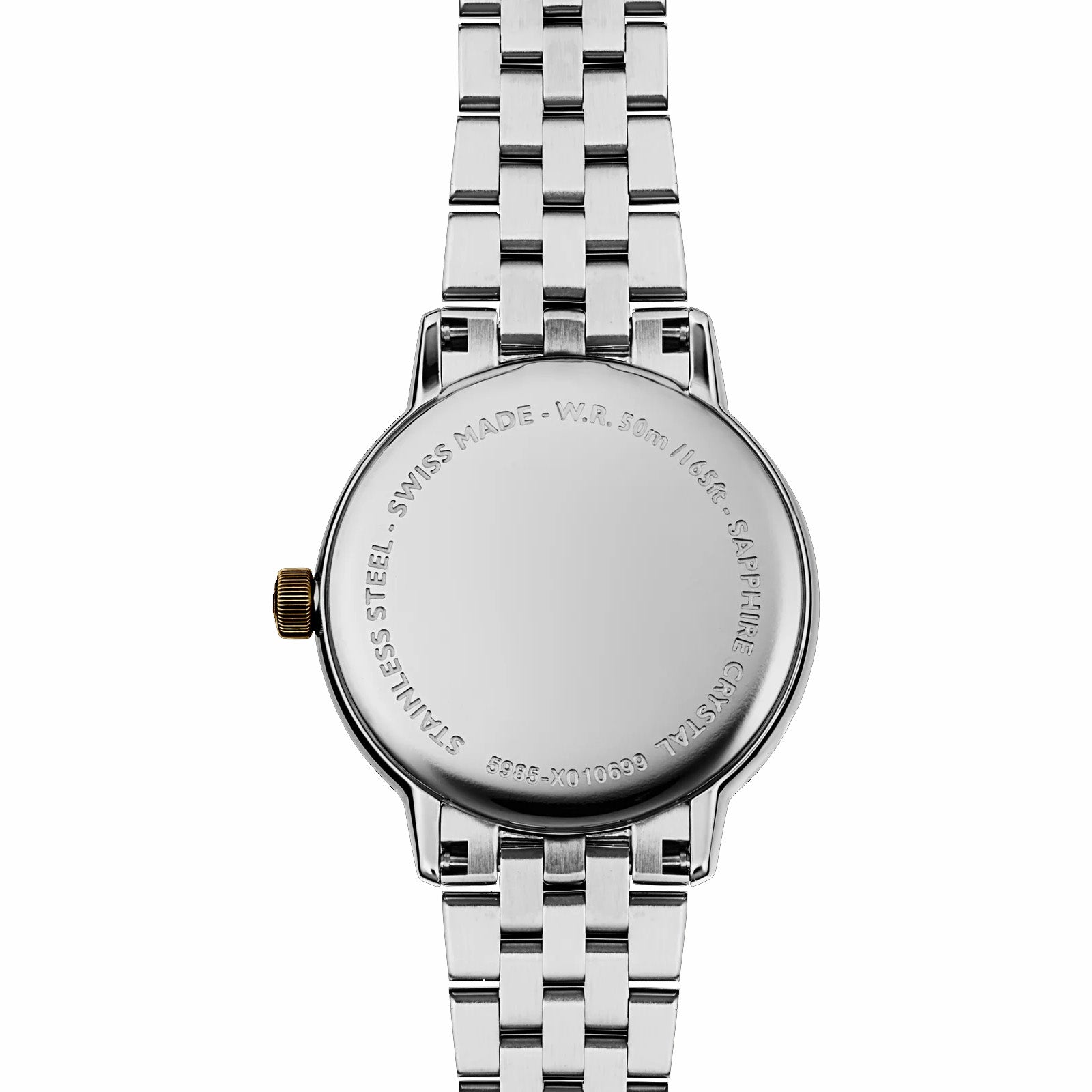 Its 29 mm case is a true jewel box holding a white mother of pearl dial, 11 sparkling diamonds and a blend of steel and yellow gold plating. Timeless and elegant, Toccata proves beauty is not always fleeting. Refined design and timeless materials: toccata will impress women on whom time holds no dominion. This elegant and timeless collection celebrates the artistic and musical spirit behind the Brand’s DNA. Following in the footsteps of the great composers, toccata promotes RAYMOND WEIL’s Swiss horology while respecting the tradition and heritage handed down from generation to generation within the family company. Technical datas Collection: toccata Size: ladies Shape: round Movement: quartz Movement Caliber Height: 2.5 mm Case Material: stainless steel with yellow gold PVD plating Case size: 29 mm Case Thickness: 6.79 mm Case Back: snapped Water Resistance: 50 m, 165 ft, 5 atm Crystal: sapphire Dial: white mother-of-pearl, set with diamonds Crown: with RW logo Clasp: stainless steel folding clasp with double push-security system Bracelet stainless steel with yellow gold PVD plating