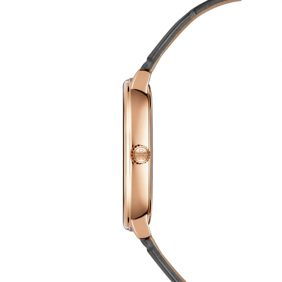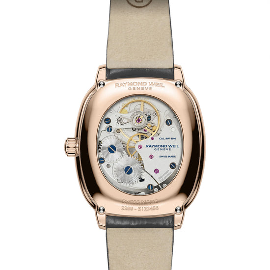 Bridging past and present, the toccata heritage timepieces embody nearly five decades of RAYMOND WEIL’s expertise in watchmaking. The graceful oval case, crafted in polished stainless steel, houses a quartz movement. A testament to the Maison’s dedication to Swiss accuracy and enduring reliability. The sun rayed blue dial captures light with subtle sophistication. Applied indexes and dauphine hands achieve perfect visual balance, reflecting the harmony between technical precision and aesthetic grace. Fitted with a blue genuine calf leather strap and a newly designed tongue buckle echoing the case’s shape, the toccata heritage offers both comfort and timeless character. With its slim profile and refined oval form, this creation celebrates the enduring dialogue between music and time that defines the Maison. A vibrant tribute to timeless elegance, where history is reinvented to engage in a dialogue with the now. This new interpretation blends timeless elegance with modernity, staying true to the visionary spirit of its founder, Mr. Raymond Weil: an elegant Swiss watchmaking, crafted with meticulous attention to detail. Description Technical datas Collection: toccata Shape: Oval Movement: Mechanical with manual winding - RW4100 Power Reserve: 45 hours Case Material: Stainless steel with rose gold PVD coating Case size: 33 mm x 38 mm Case Thickness: 6.95 mm Case Back: Screwed, with sapphire crystal Water Resistance: 30 m, 98 ft, 3atm Crystal: Sapphire crystal with double-sided anti-reflective treatment Dial: Sun rayed copper with applied indexes Crown: Fluted with RW monogram Clasp: Stainless steel traditional buckle with rose gold PVD plating Bracelet Grey genuine calf leather