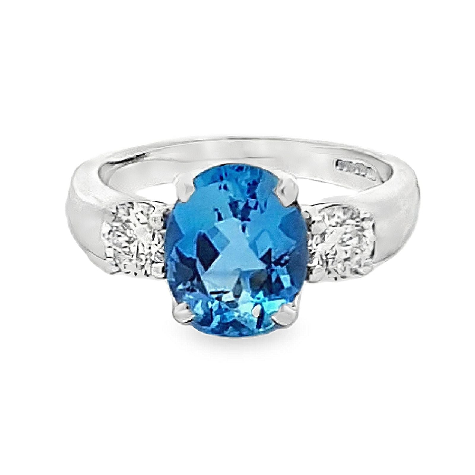 This beautiful 18ct white gold trilogy ring features an oval cut Aquamarine & 2 x round brilliant cut Diamonds in a claw setting. Aquamarine:2.29ct. Diamond :0.69ct This ring is a size N.