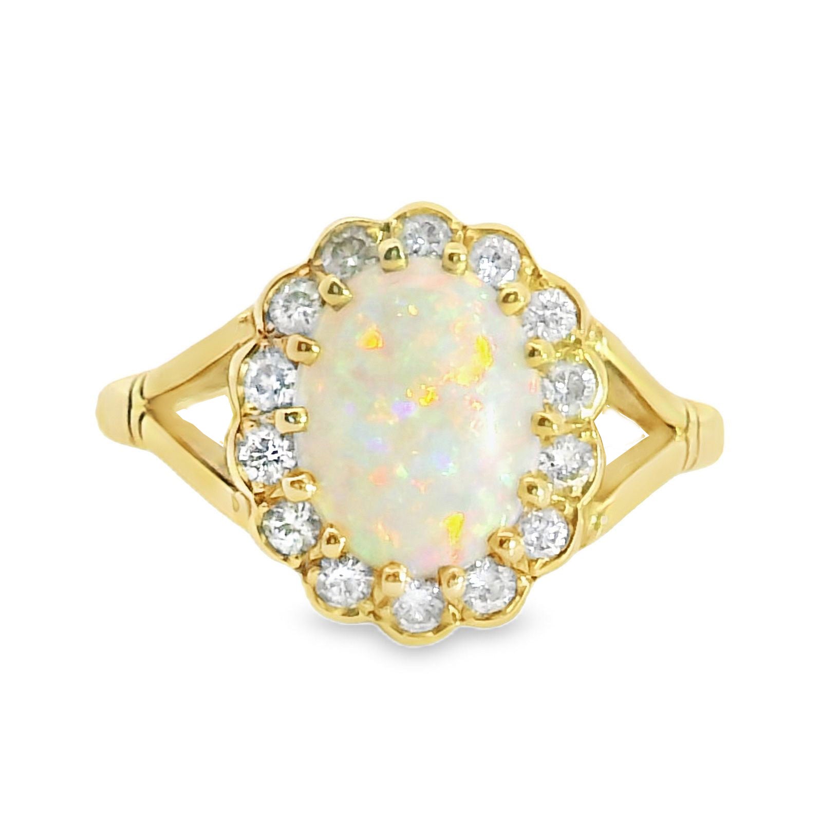18ct yellow gold Opal and Diamond Cluster ring. This ring features a stunning oval opal of 3.50ct that has flashes of rainbow colours and is surrounded by white diamonds 0.09ct ?áand set and secured by an 18ct yellow gold claw setting,