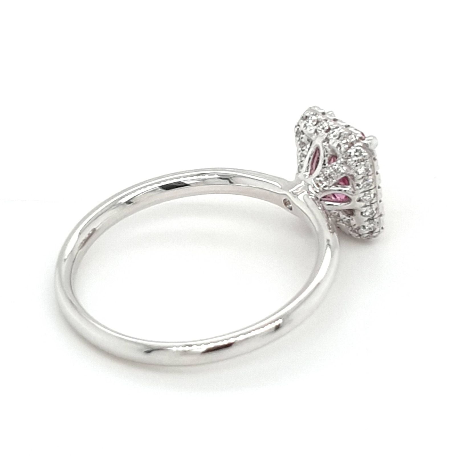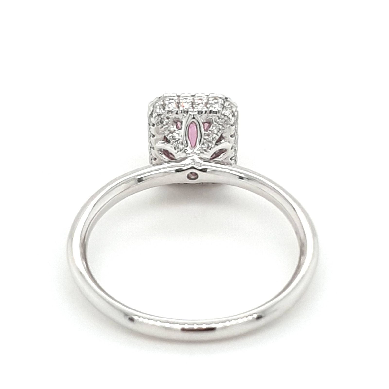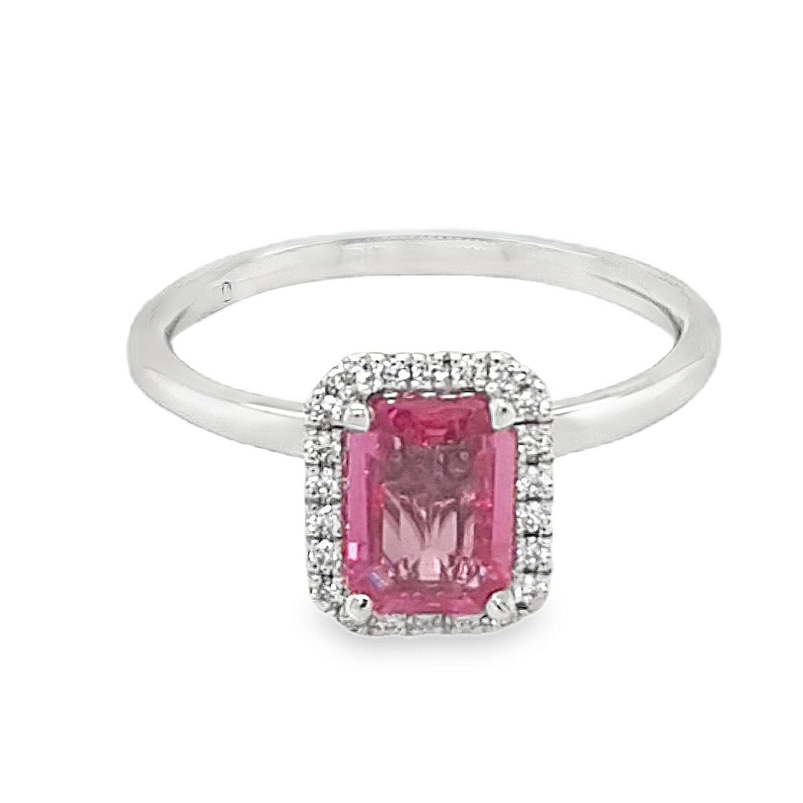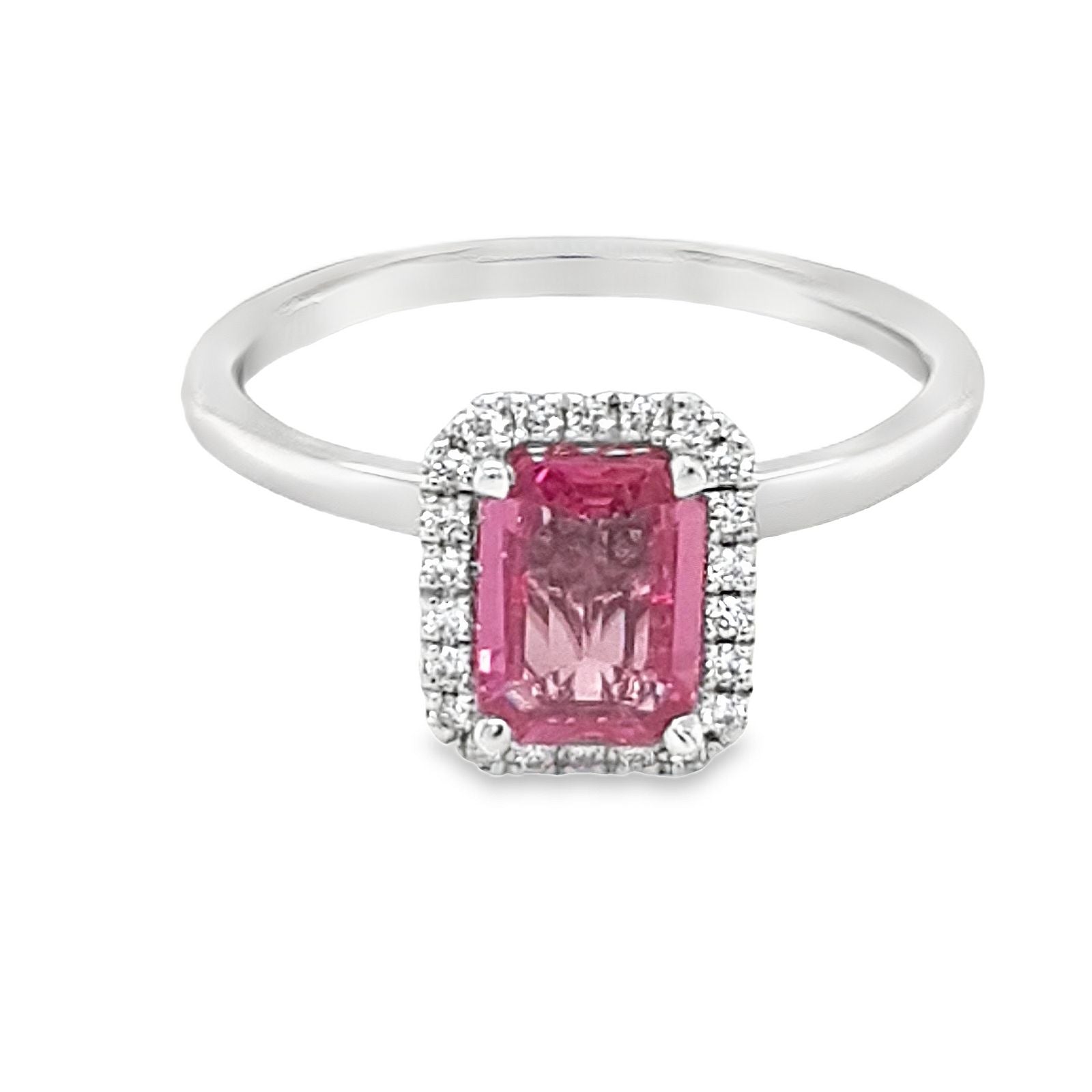 This very special unique 18ct white gold cluster ring features a central claw set emerald cut vivid pink sapphire. It measures 7x5mm and is 0.93ct. The surrounding and under setting diamonds are micro claw set and are all white round brilliant cut diamonds 0.20ct with G/H colour and SI clarity. This ring is a size L.