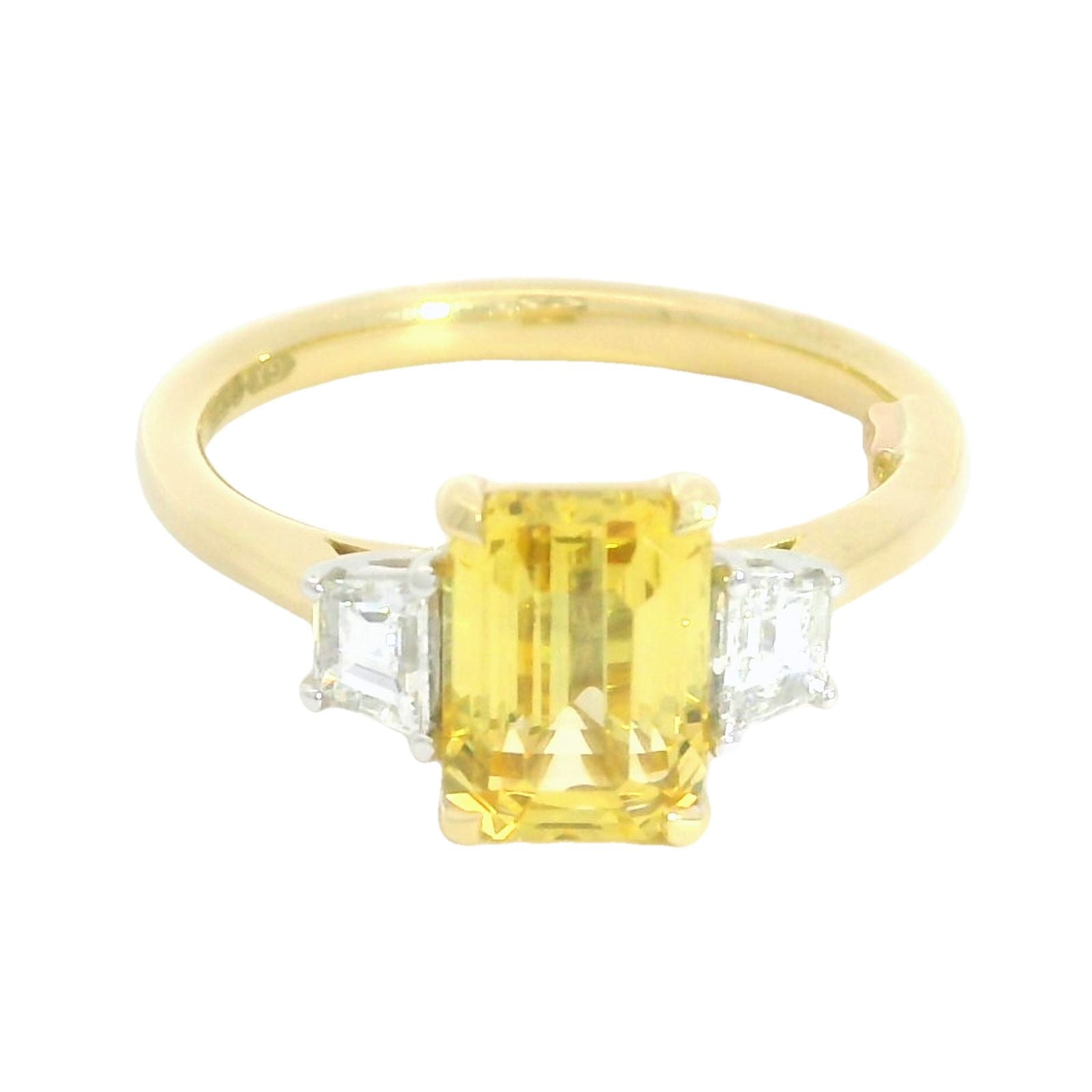 18ct Yellow Gold ring set with a Yellow, (Ceylon), Sapphire & White Diamonds in a Trilogy setting. This ring is from our 1887 collection, all the gemstones are hand selected by our experts and this ring is crafted in an18ct yellow gold mount. The stunning Emerald Cut Ceylon vivid yellow sapphire is flanked by a trapeze cut diamond on each side.?á