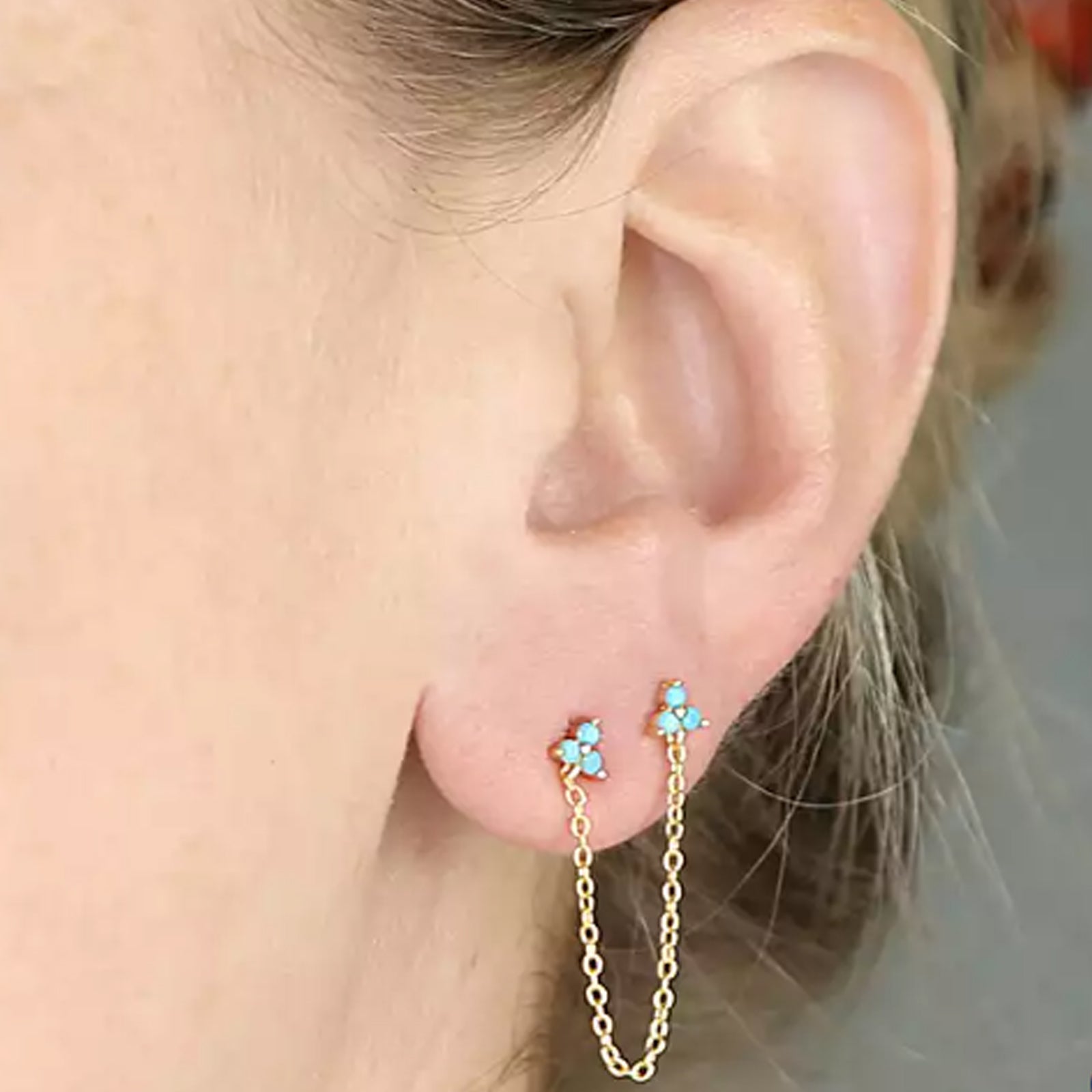 Sterling Silver Earring Yellow gold plated double nano-turquoise trio stud Chain drop.Weight:Approx.1.30gm Height: 4.00mm Width: 4.00mm Depth: 2.00mm Diameter: 4.00mm Metal: 925 Sterling Silver Finish: 0.25micron 14ct yellow gold plate