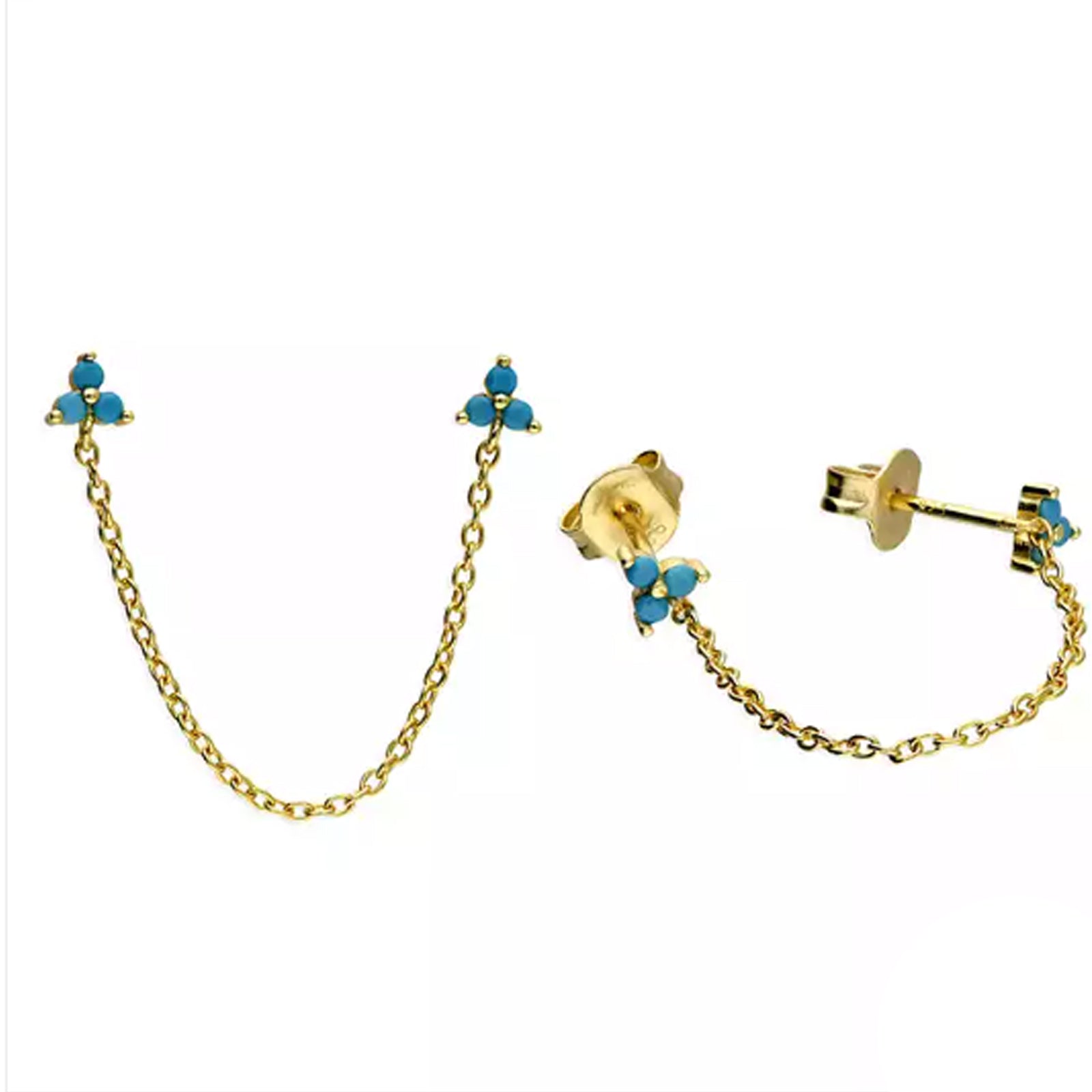 Silver Gold Plated Double Turquoise Trio Petal Chain Stud Earring