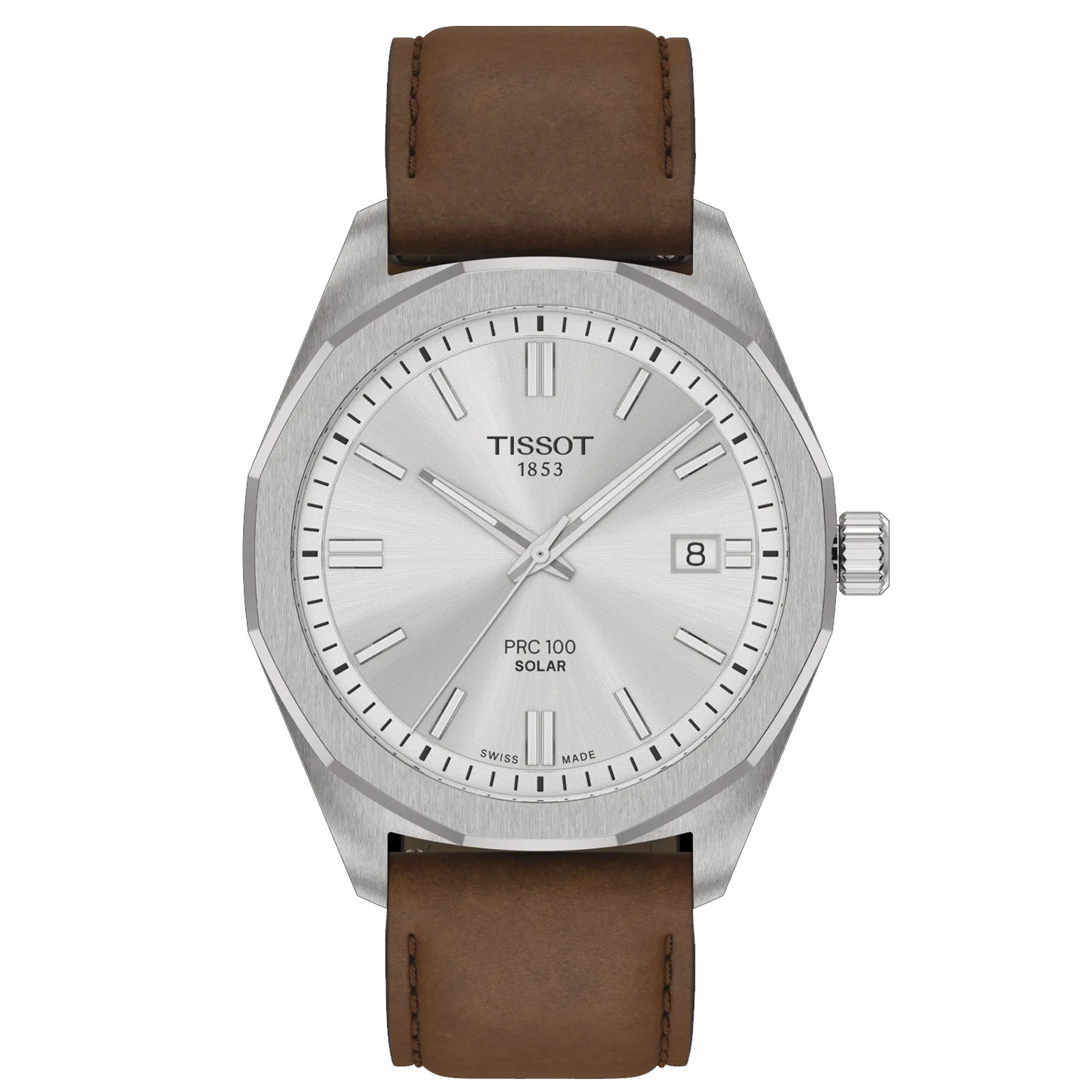 First introduced in the mid-2000s, the PRC 100 was recognised for its striking design, carving out its place in Tissot’s collection. Today, it returns with a pioneering Lightmaster Solar Quartz movement, harnessing photovoltaic energy to fuel every second. With its 39mm stainless steel case and bold dodecagonal bezel, this model exudes confidence. Beneath its sleek sapphire crystal lies a solar-powered quartz movement, designed to recharge effortlessly from both natural and artificial light. The End of Energy indicator ensures optimal performance, while the compatibility with our 20 mm straps allows wearers to personalise their style, whether through classic leather or modern Milanese options. Discover this 39mm solar-powered watch with its stainless-steel case and brown leather strap. About the watch SKU T1514221603100 Collection Classic Contemporary Weight (g) 62.00 Warranty 3 Years of Warranty Country of manufacture Switzerland Case & crystal Length (mm) 39.00 Width (mm) 39.00 Thickness (mm) 9.22 Lug width (mm) 20.00 Water resistance Water-resistant up to a pressure of 10 bar (100 m / 330 ft) Case shape Round Case material 316L stainless steel case Crystal Scratch-resistant sapphire crystal Movement Energy Quartz Movement Swiss quartz solar Battery Accumulator type Panasonic CTL920F Dial HMSD (Hour, Minute, Second, Date) Caliber 11 1/2''' Diameter (mm) 25,6 Dial Dial colour Silver Indexes Indexes Luminescent material on the hands Super-LumiNova Strap Strap/Chain reference T600050757 Strap length 6h (mm) 120.00 Strap length 12h (mm) 80.00 Strap front Embossed cow leather Strap back Synthetic Strap colour Brown Buckle Standard buckle, Interchangeable quick release bracelet Buckle options Interchangeable quick release bracelet