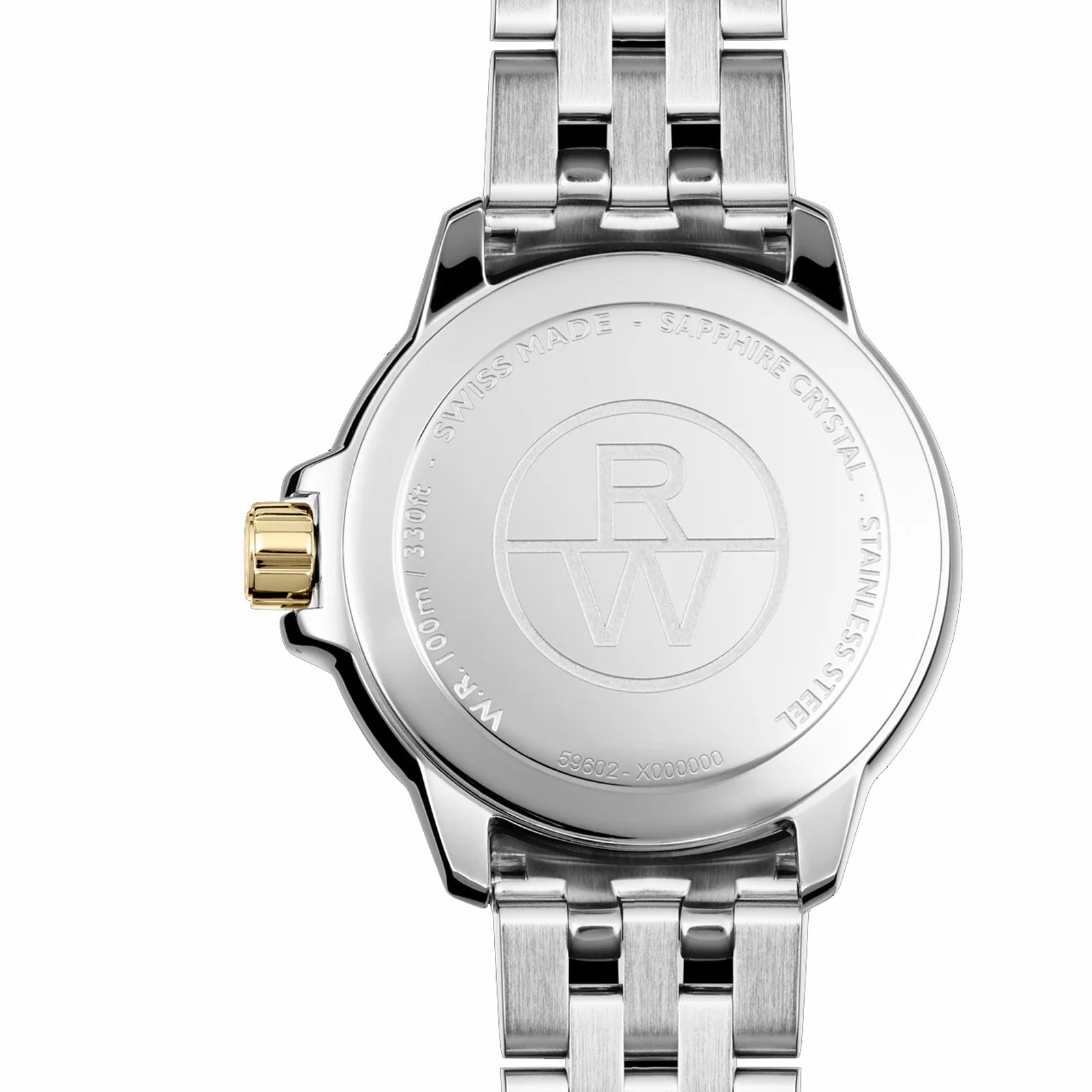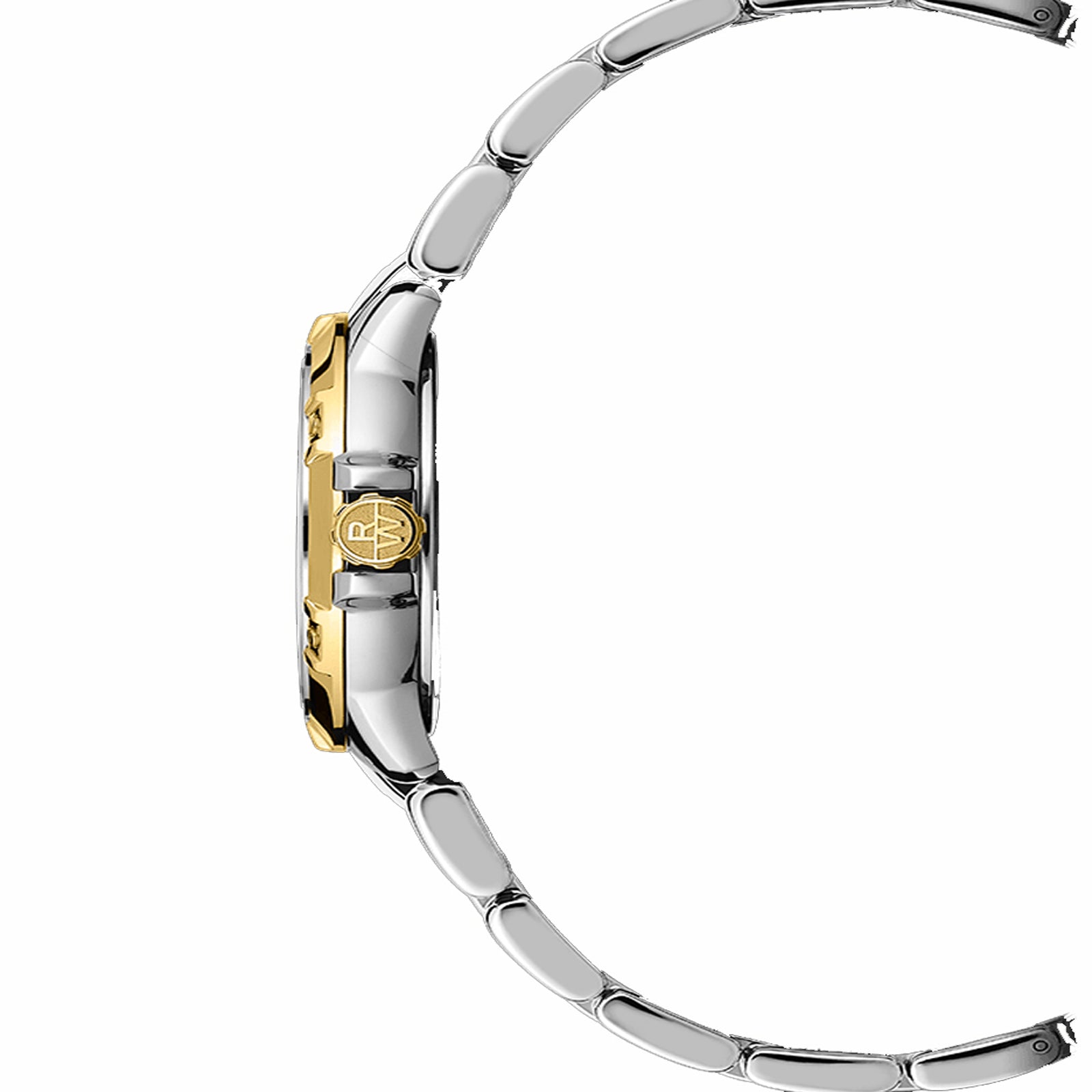 This two-tone stainless steel bracelet watch features a delicate white mother-of-pearl dial adorned with 8 diamonds and punctuated by gold-plated Roman numeral markers, offering a unique look and feel. The tango classic ladies two-tone stainless steel wristwatch comes with a sleek steel wristband and casing. Equipped with a quartz movement and a date function at 3 o'clock, keep time with its easily read analog display. Water resistant up to 100 meters with a scratch-resistant surface, it offers durability in a comfortable and stylish bracelet watch. Modesty and elegance are the key principles of this modern classic. Technical datas Collection: tango Size: ladies Shape: round Movement: quartz Movement Caliber Height: 2.5 mm Case Material: stainless steel with yellow gold PVD plating Case size: 30 mm Case Thickness: 7.35 mm Case Back: snapped Water Resistance: 100 m, 330 ft, 10 atm Crystal: sapphire Dial: white mother-of-pearl, with Roman numerals and set with diamonds Crown: screwed-down, with RW logo Clasp: stainless steel folding clasp with double push security system Bracelet stainless steel with yellow gold PVD plating