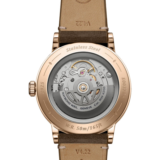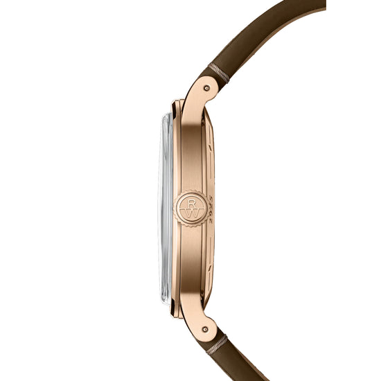 For this inaugural millesime collection, RAYMOND WEIL pays homage to the rich heritage and traditions of horology while celebrating the simplicity of refined design. Millesime timepiece offer a period charm combined with present-day practicality. The silver dial, located beneath a vintage-inspired sapphire crystal glass-box, has been refined to the highest degree. The hours and minutes are eloquently conveyed with rose gold hands, lined with Super-LumiNova. The sector dial presents the hours, minutes and seconds periods on discrete tracks, augmenting readability. A closer inspection of the dial reveals contrasting finishes, the hour track is smooth, the minute track is snailed and the central area of the dial is adorned with a delicate vertical brush. The bezel is decorated with a vertical satin-brush that contrasts wonderfully with the highly polished bevel nearby. This juxtaposition of two finishes reinforces the overall level of finishing. A sapphire case back affords sight of the self-winding movement within and the “W-shaped” oscillating weight, RAYMOND WEIL’s horological signature. Offered in a selection of dial colours, each model is paired with a colour-coordinating genuine calf leather strap with a unique W-stitched detail. As the name suggests, the collection is a grand vintage interpretation of the RAYMOND WEIL brand. Technical datas Collection: millesime Size: Gents Shape: Round Movement: Mechanical with automatic winding RW4200 Power Reserve: 41 hours Movement Caliber Height: 4.6 mm Case Material: Stainless steel with rose gold PVD plating Case size: 39 mm Case Thickness: 9.25 mm Case Back: Snapped, with sapphire crystal Water Resistance: 50 m, 165 ft, atm Crystal: Glass box sapphire crystal with dual-sided antireflective treatment Dial: Silver sector dial, with various finishes Crown: Fluted with RW monogram Clasp: Stainless steel traditional buckle with rose gold PVD plating Bracelet Brown genuine calf leather with a unique W-stitched detail