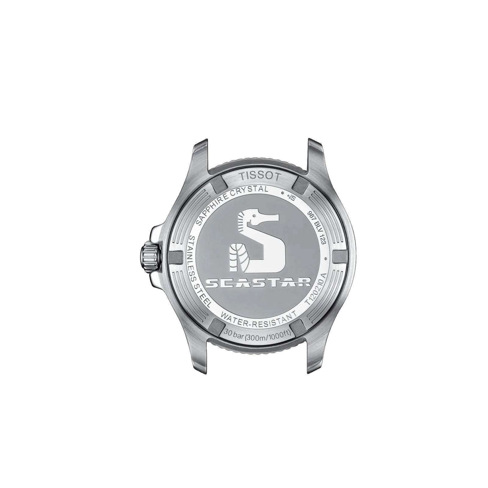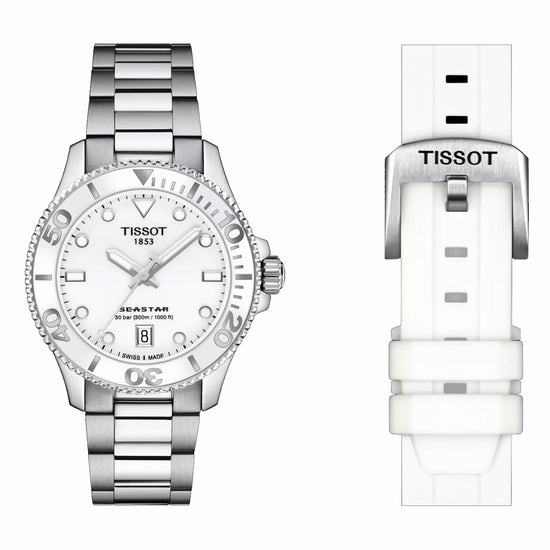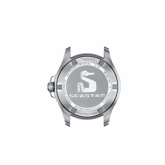 In crystal clear waters, you can see the sun rays breaking through the surface. In your mind, only calm. On your wrist, the Seastar 1000, the door to this underwater world. Chic, assertive and versatile, the new Seastar 36mm watches feature a stainless steel case and bracelet, a uni-directional rotating bezel with a mineral glass insert, a screw-down crown and water resistance up to 30 bar (300m / 1000ft). And if you want, you can quickly switch the bracelet for an orange, white, light-blue or black silicone strap. Change your outlook and step into another world with this watch featuring a white dial, a matching bezel and stainless steel bracelet. About the watch SKU T1202101101100 Collection Sport Weight (g) 114.00 Warranty 2 Years of Warranty Country of manufacture Switzerland Case & crystal Length (mm) 36.00 Width (mm) 36.00 Thickness (mm) 9.67 Lug width (mm) 18.00 Water resistance Water-resistant up to a pressure of 30 bar (300 m / 1000 ft) Case shape Round Case material 316L stainless steel case Case options Mineral bezel ring, Anti-clockwise rotating bezel, Screw-down crown and caseback Crystal Scratch-resistant sapphire crystal with double-sided antireflective coating Movement Energy Quartz Movement Swiss quartz Battery battery type Renata 371 Dial HMSD (Hour, Minute, Second, Date) Caliber 10 1/2''' Diameter (mm) 23.30 Dial Dial colour White Indexes Indexes Luminescent material on the hands Super-LumiNova Strap Strap/Chain reference T605047356 Strap colour Grey Buckle Folding clasp with safety lock and push-buttons, Standard buckle, Interchangeable quick release bracelet Buckle options Interchangeable quick release bracelet Links reference T613047403
